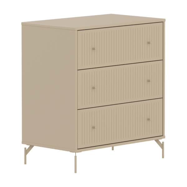 FLEXA SAGA Kommoden i Oat har 3 skuffer med soft-close mekanismer, der beskytter små fingre. Når plastikfødderne bruges, kan kommoden placeres under Flexas halvhøje senge for optimal udnyttelse af pladsen på børneværelset. De runde oat metalgreb tilføjer
